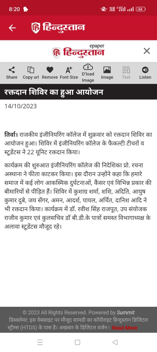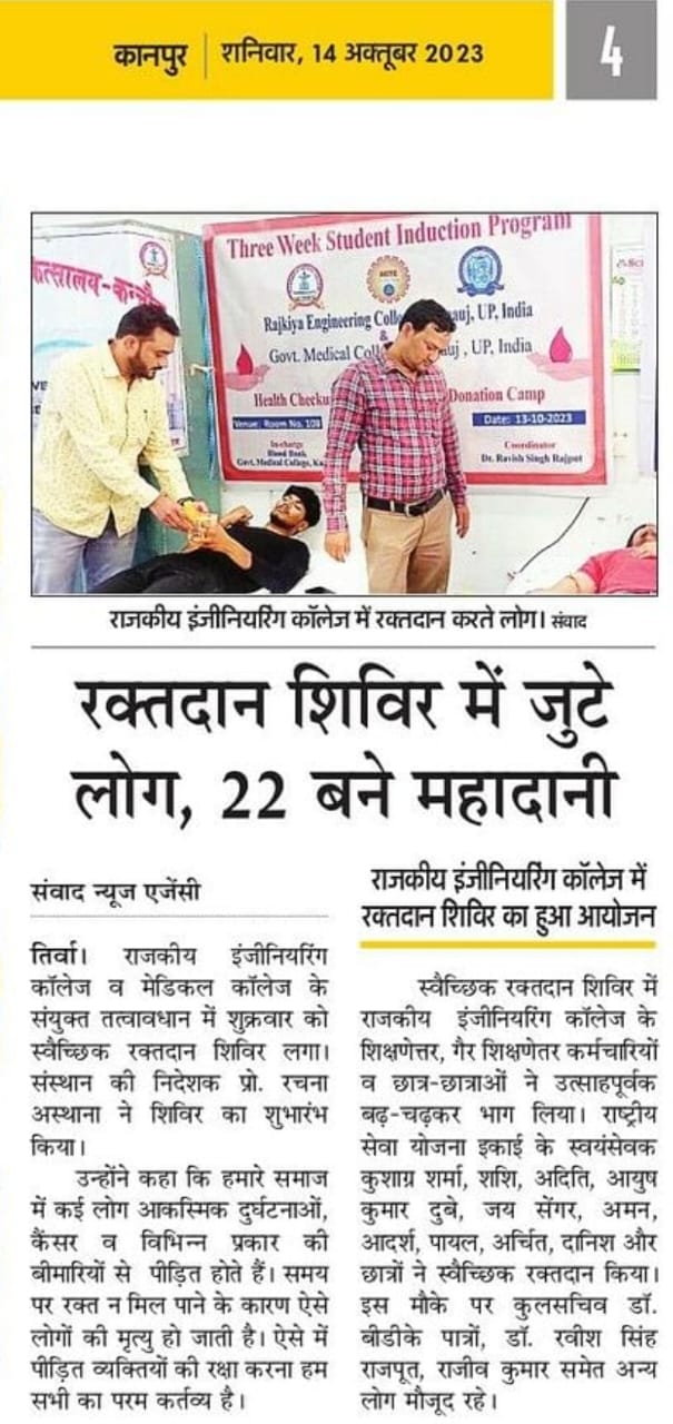 रक्तदान-महादान, कमजोरी नहीं बीमारियां होती दूर स्त्रोत-दैनिक जागरण दिनांक 14.10.2023